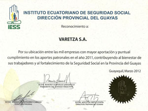 Por su ubicación entre las mil empresas con mayor aportación y puntual cumplimiento en los aportes patronales en el 2011, contribuyendo al bienestar de sus trabajadores y al fortalecimiento de la Seguridad Social en la Provincia del Guayas.