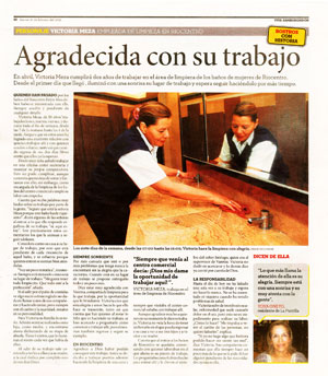 En abril, Victoria Meza cumplirá dos años de trabajar en el área de limpieza de los baños de mujeres de Riocentro. Desde el primer día que llegó, iluminó con una sonrisa su lugar de trabajo y espera seguir haciéndolo por más tiempo.